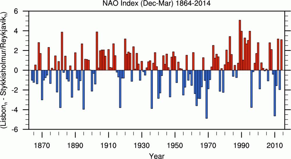 Európa időjárásának alakításában meghatározó szerepet játszik az Atlanti óceán északi térségében kifejlődő Izland közeli minimum és az Azori-szigetek közeli maximum légnyomás központ, amelyek helyzetéből adódóan általában nyugatias légáramlás alakul ki, ami ciklonokat szállít a kontinens belsejébe. Az izlandi minimum és az azori maximum légnyomás közötti különbség időben ingadozik, ez az ingadozás az Észak-Atlanti Oszcilláció, ami a NAO-index-szel jellemezhető. A NAO-index számítására több módszer létezik. A NAO-index leghosszabb idősora a portugáliai Lisszabonban és az izlandi Stykkisholmurban mért, tengerszintre átszámított légnyomások különbségének normalizált értéke, amelynek téli időszakra számított idősorát az ábra mutatja be.